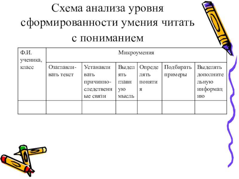 Слайд 12Схема анализа уровня сформированности умения читать с пониманием