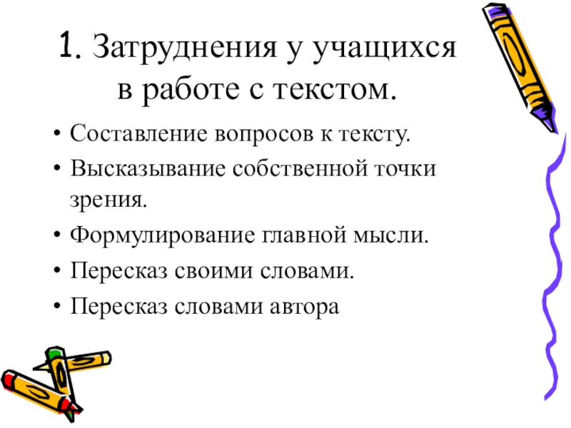 Слайд 21. Затруднения у учащихся в работе с текстом.