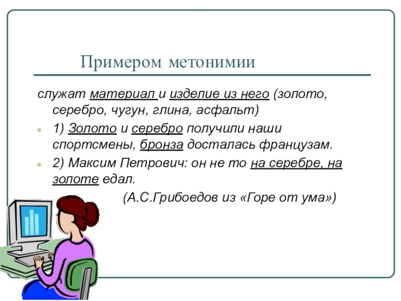 Примером метонимиислужат материал и изделие из него (золото, серебро, чугун, глина, асфальт)1) Золото