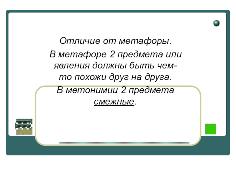 Отличие от метафоры.В метафоре 2 предмета или явления должны быть чем-то похожи друг на друга.В метонимии 2