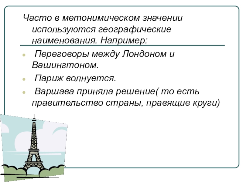 Часто в метонимическом значении используются географические наименования. Например: Переговоры между Лондоном и Вашингтоном. Париж волнуется. Варшава приняла