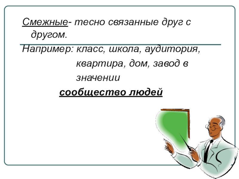 Смежные- тесно связанные друг с другом.Например: класс, школа, аудитория,
