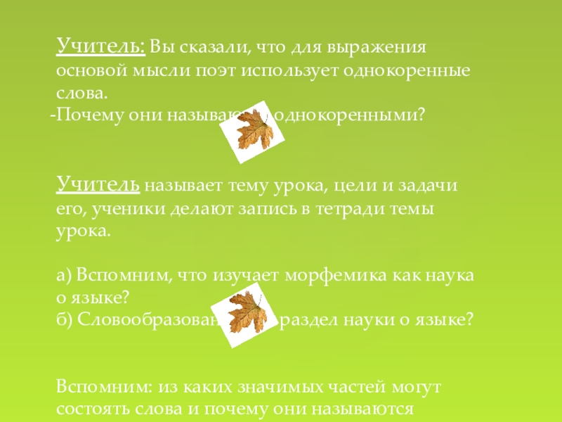 Слайд 6Учитель: Вы сказали, что для выражения основой мысли поэт использует однокоренные