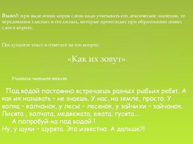 Слайд 13Вывод: при выделении корня слова надо учитывать его лексическое значение, те