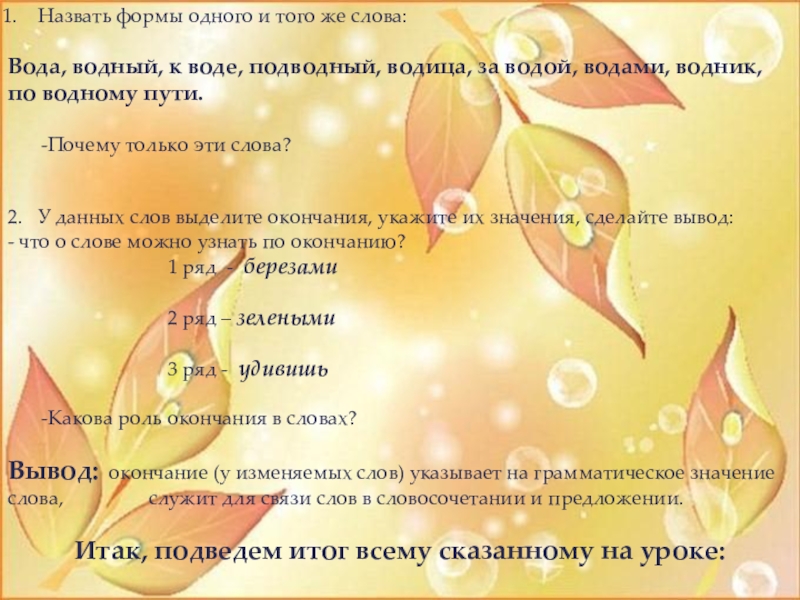 2. У данных слов выделите окончания, укажите их значения, сделайте вывод: