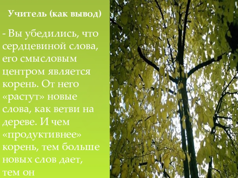 От него «растут» новые слова, как ветви на дереве. И чем «продуктивнее» корень, тем больше новых слов дает, тем он жизнеспособнее.