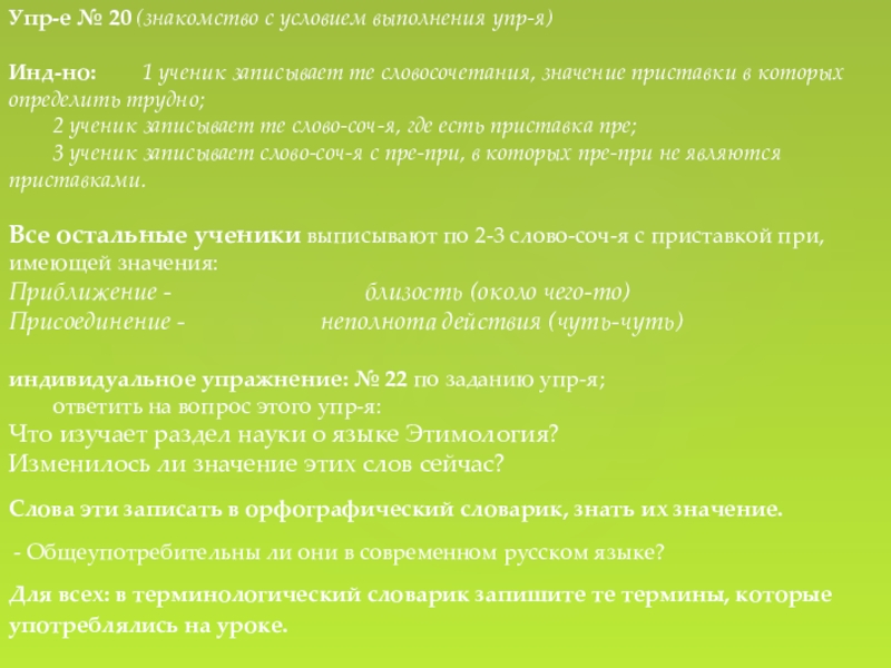Слайд 16Упр-е № 20 (знакомство с условием выполнения упр-я)