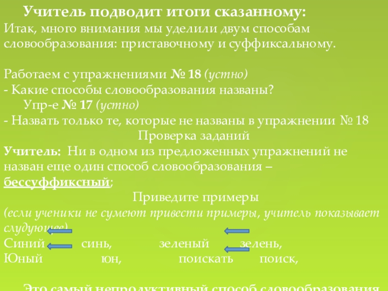 Учитель: Ни в одном из предложенных упражнений не назван еще один способ словообразования – бессуффиксный;