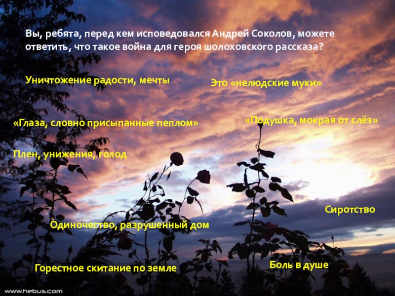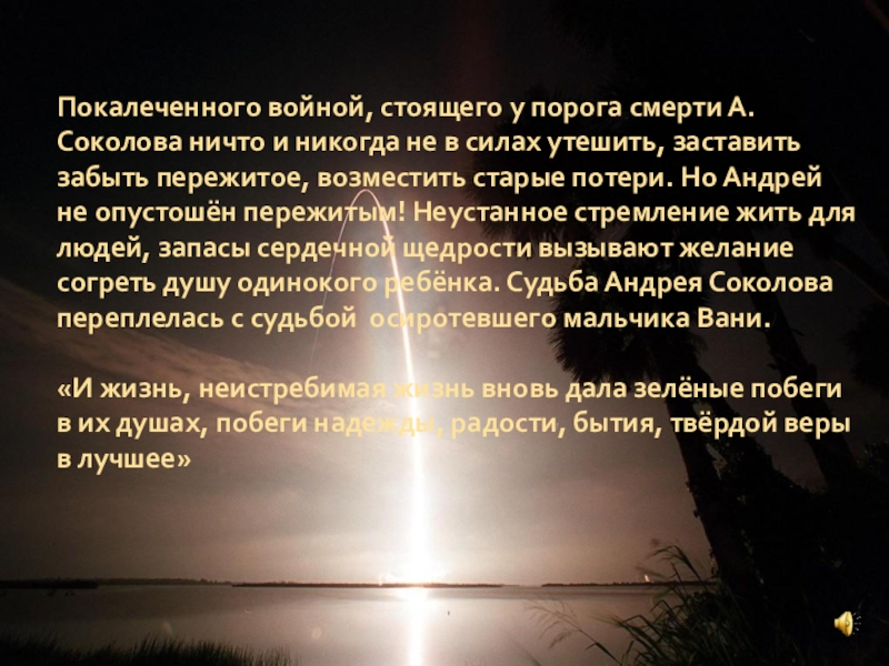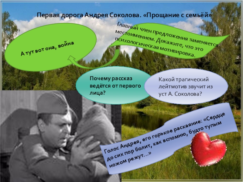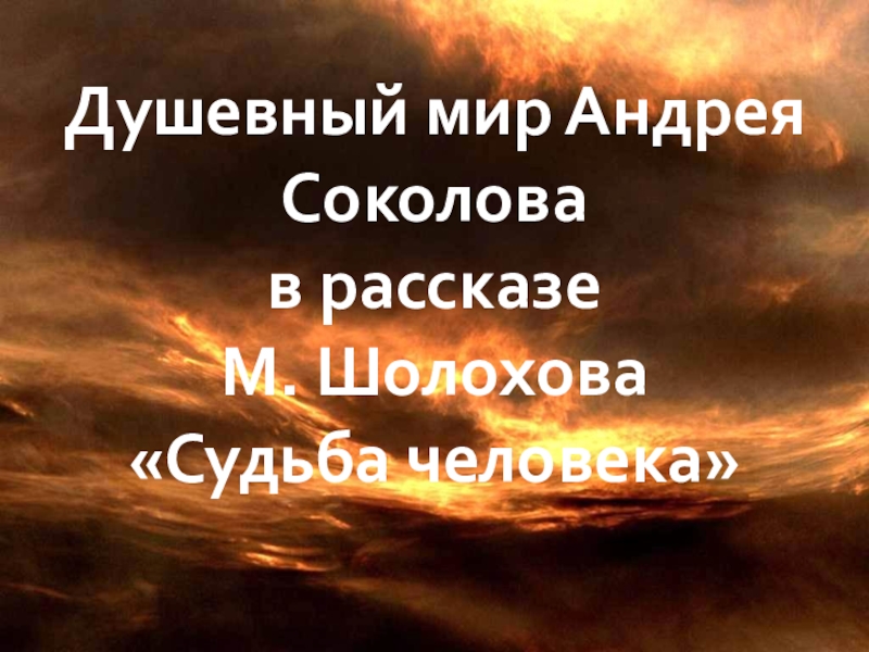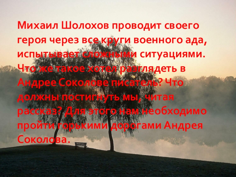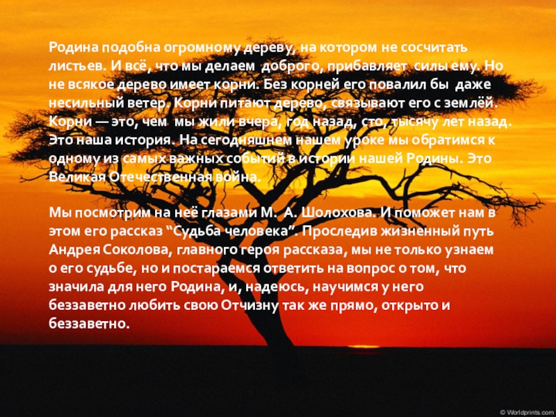 Мы посмотрим на неё глазами М. А. Шолохова. И поможет нам в этом его рассказ “Судьба человека”. Проследив жизненный путь Андрея Соколова, главного героя рассказа, мы не только узнаем о его судьбе, но и постараемся ответить на вопрос о том, что значила для него Родина, и, надеюсь, научимся у него беззаветно любить свою Отчизну так же прямо, открыто и беззаветно.
