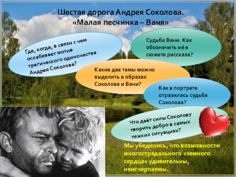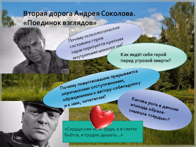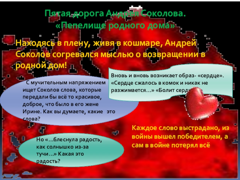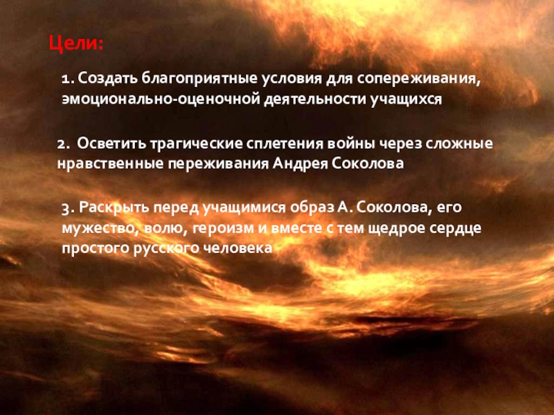 3. Раскрыть перед учащимися образ А. Соколова, его мужество, волю, героизм и вместе с тем щедрое сердце простого русского человека