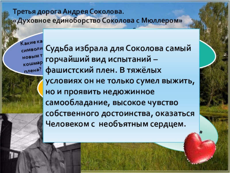 Судьба избрала для Соколова самый горчайший вид испытаний – фашистский плен. В тяжёлых условиях он не только сумел выжить, но и проявить недюжинное самообладание, высокое чувство собственного достоинства, оказаться Человеком с необъятным сердцем.