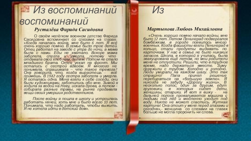 О своём нелёгком военном детстве Фарида Сасидовна вспоминает со слезами на глазах: «Когда началась война, мне было 6 лет. Я всё очень хорошо помню. В семье было трое детей. Отец работал на заводе с утра до ночи, а мама была с нами. Еды не хватало. Вскоре мама заболела, слегла и умерла, потому что отдавала свой хлеб нам, детям. Потом не стало младшего брата. Отец уехал на фронт. Мы остались с сестрой вдвоём. Я многого не понимала, спрашивала – что такое тревога? Она говорила, что, когда вырастешь - всё поймёшь. В 1942 году сестра заболела и умерла. Я осталась одна. Меня взяли к себе соседи, они были художниками, заботились обо мне. Зимой я ходила за водой на Неву, искала дрова, а летом – собирала разные травы, на рынке продавала вещи своих умерших родственников.
