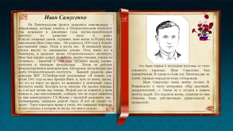 Это была первая и последняя весточка от этого отважного паренька. Иван Самусенко был пулемётчиком. В одном из боёв под Ленинградом он погиб, отражая очередную атаку гитлеровцев.