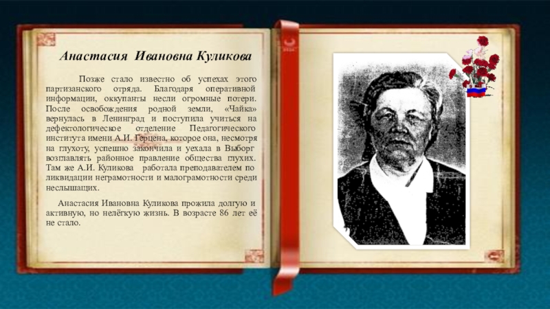 Великая Отечественная война застала А.И.Куликову в Псковской области, где жили её родственники. Невольно оказавшись в оккупации, 25-летняя девушка не могла оста- ваться без дела – ей удалось связаться с партизанами.