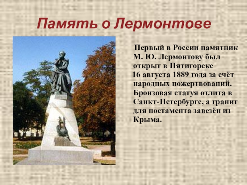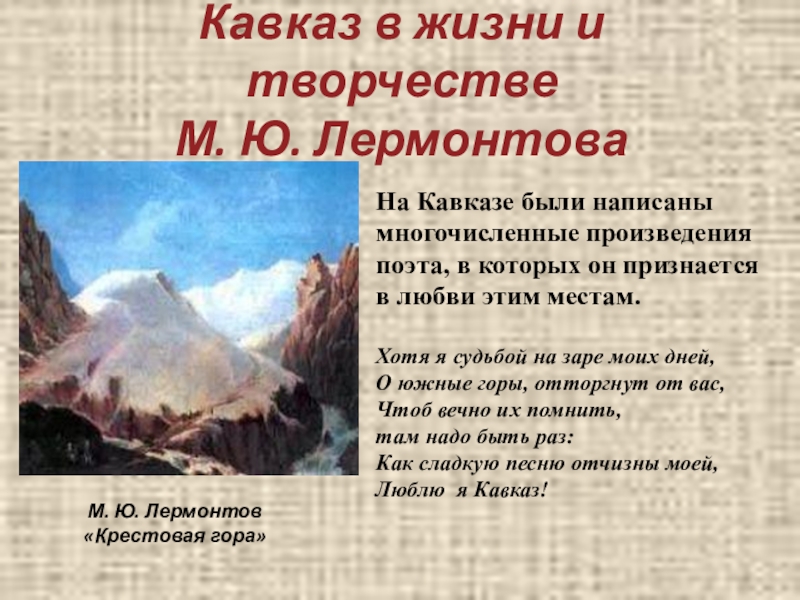 воды, которые совершенно исцелили мальчика. Впечатления от этих поездок остались у Лермонтова в памяти на всю жизнь.