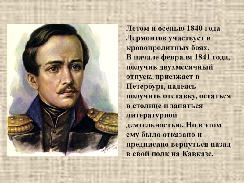 начале февраля 1841 года, получив двухмесячный отпуск, приезжает в Петербург, надеясь получить отставку, остаться в столице и заняться литературной деятельностью. Но в этом ему было отказано и предписано вернуться назад в свой полк на Кавказе.