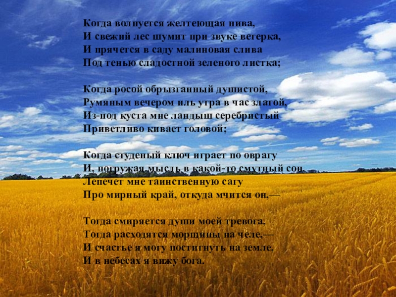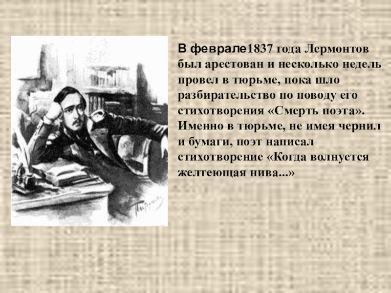 тюрьме, пока шло разбирательство по поводу его стихотворения «Смерть поэта». Именно в тюрьме, не имея чернил и бумаги, поэт написал стихотворение «Когда волнуется желтеющая нива...»