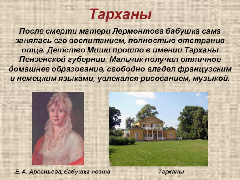 отца. Детство Миши прошло в имении Тарханы Пензенской губернии. Мальчик получил отличное домашнее образование, свободно владел французским и немецким языками, увлекался рисованием, музыкой.