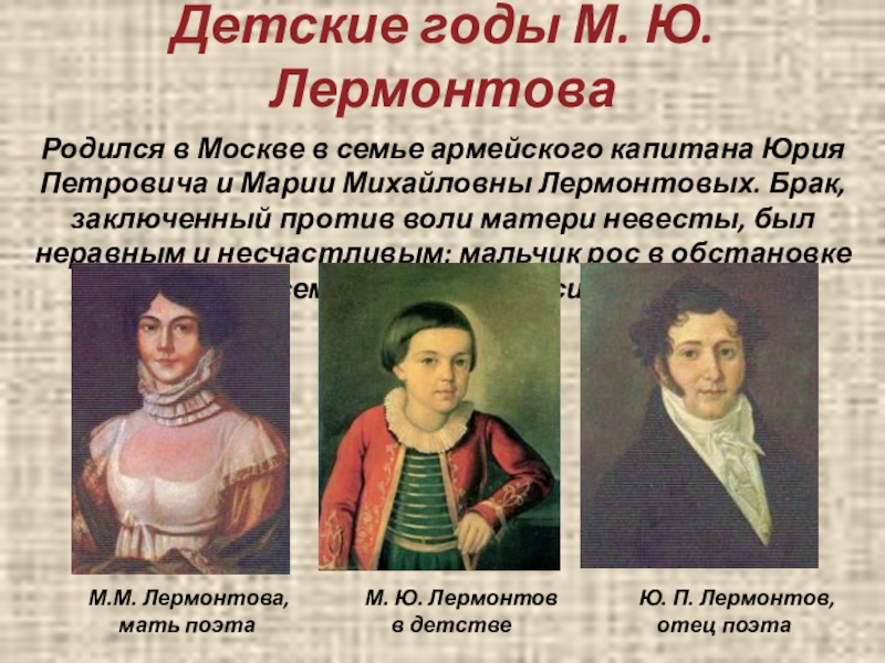 Юрия Петровича и Марии Михайловны Лермонтовых. Брак, заключенный против воли матери невесты, был неравным и несчастливым; мальчик рос в обстановке семейных несогласий.