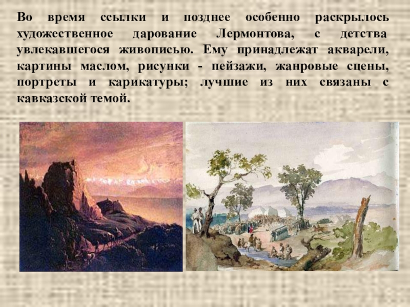 Слайд 12Во время ссылки и позднее особенно раскрылось художественное дарование Лермонтова, с