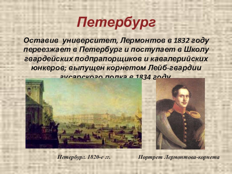 Оставив университет, Лермонтов в 1832 году переезжает в Петербург и поступает