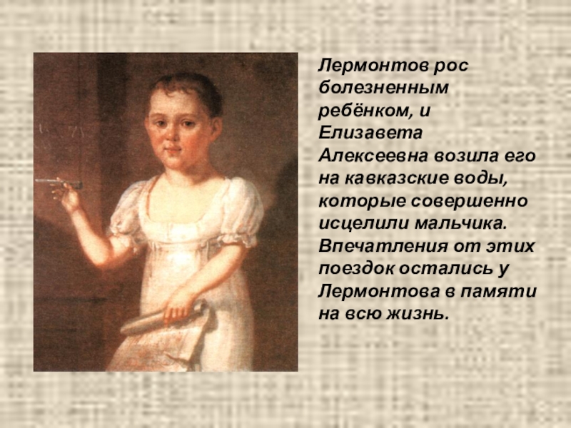 Лермонтов рос болезненным ребёнком, и Елизавета Алексеевна возила его на кавказские