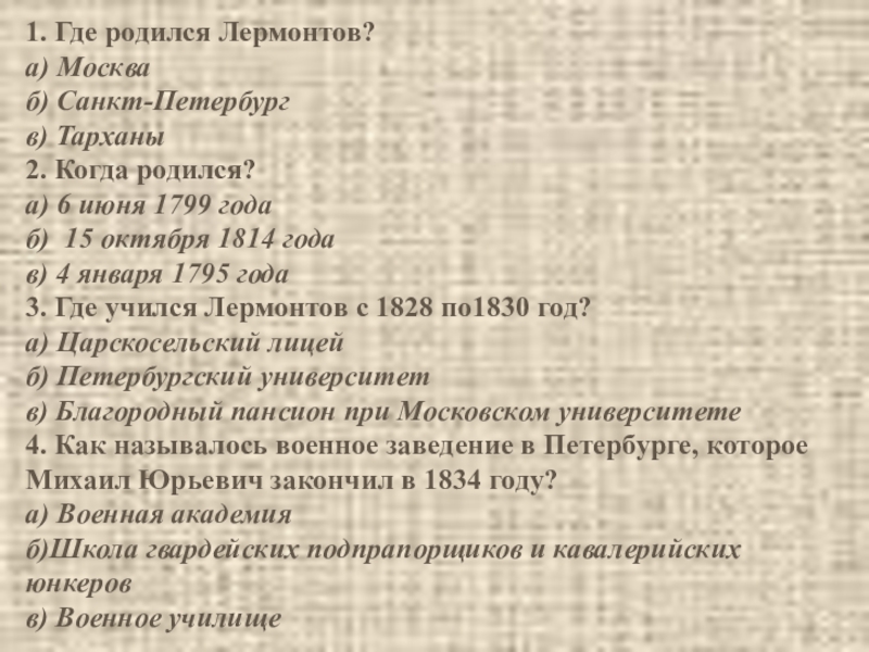 4. Как называлось военное заведение в Петербурге, которое Михаил Юрьевич закончил в 1834 году?