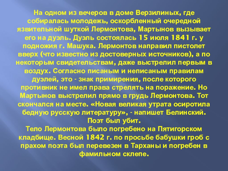 очередной язвительной шуткой Лермонтова, Мартынов вызывает его на дуэль. Дуэль состоялась 15 июля 1841 г. у подножия г. Машука. Лермонтов направил пистолет вверх (что известно из достоверных источников), а по некоторым свидетельствам, даже выстрелил первым в воздух. Согласно писаным и неписаным правилам дуэлей, это - знак примирения, после которого противник не имел права стрелять на поражение. Но Мартынов выстрелил прямо в грудь Лермонтова. Тот скончался на месте. «Новая великая утрата осиротила бедную русскую литературу», - напишет Белинский. Поэт был убит.