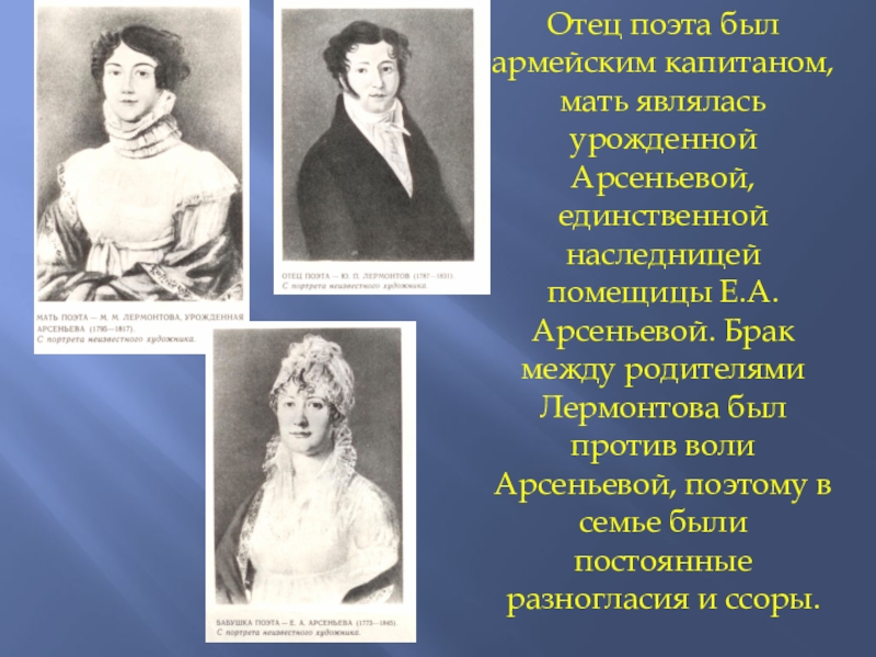 Слайд 2Отец поэта был армейским капитаном, мать являлась урожденной Арсеньевой, единственной наследницей