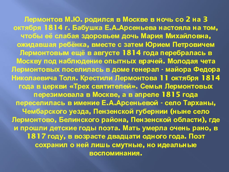 октября 1814 г. Бабушка Е.А.Арсеньева настояла на том, чтобы её слабая здоровьем дочь Мария Михайловна, ожидавшая ребёнка, вместе с затем Юрием Петровичем Лермонтовым ещё в августе 1814 года перебралась в Москву под наблюдение опытных врачей. Молодая чета Лермонтовых поселилась в доме генерал - майора Федора Николаевича Толя. Крестили Лермонтова 11 октября 1814 года в церкви «Трех святителей». Семья Лермонтовых перезимовала в Москве, а в апреле 1815 года переселилась в имение Е.А.Арсеньевой - село Тарханы, Чембарского уезда, Пензенской губернии (ныне село Лермонтово, Белинского района, Пензенской области), где и прошли детские годы поэта. Мать умерла очень рано, в 1817 году, в возрасте двадцати одного года. Поэт сохранил о ней лишь смутные, но идеальные воспоминания.
