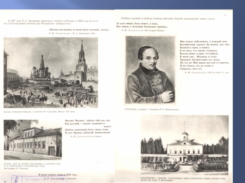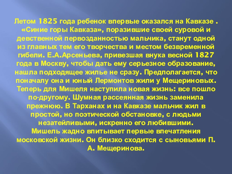 поразившие своей суровой и девственной первозданностью мальчика, станут одной из главных тем его творчества и местом безвременной гибели. Е.А.Арсеньева, привезшая внука весной 1827 года в Москву, чтобы дать ему серьезное образование, нашла подходящее жилье не сразу. Предполагается, что поначалу она и юный Лермонтов жили у Мещериновых. Теперь для Мишеля наступила новая жизнь: все пошло по-другому. Шумная рассеянная жизнь заменила прежнюю. В Тарханах и на Кавказе мальчик жил в простой, но поэтической обстановке, с людьми незатейливыми, искренно его любившими.