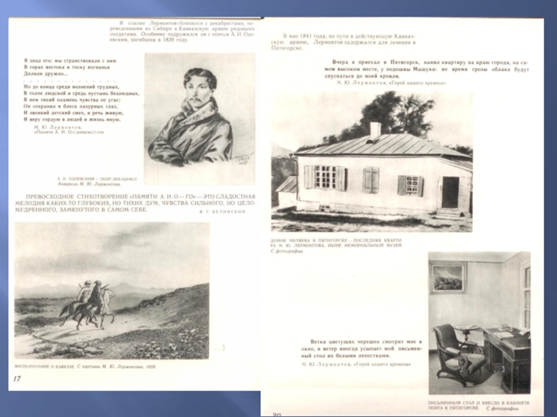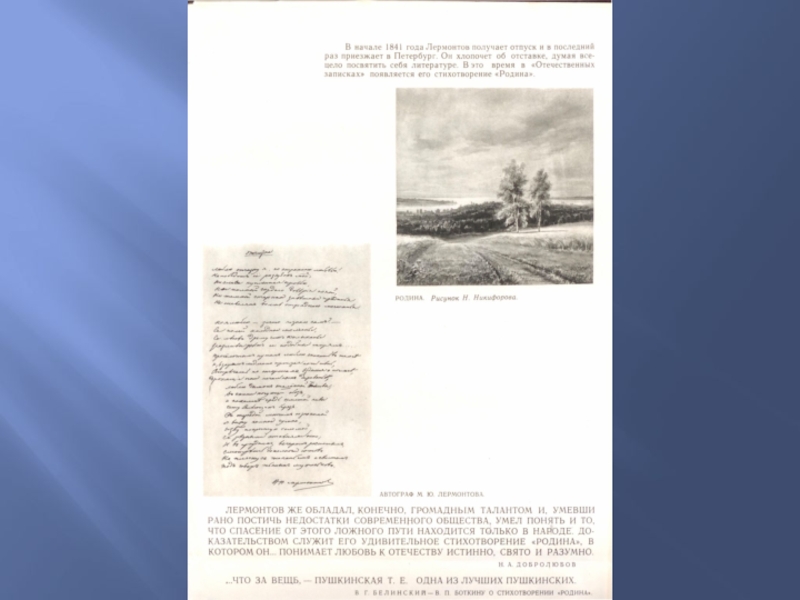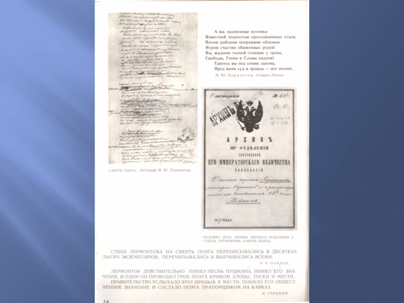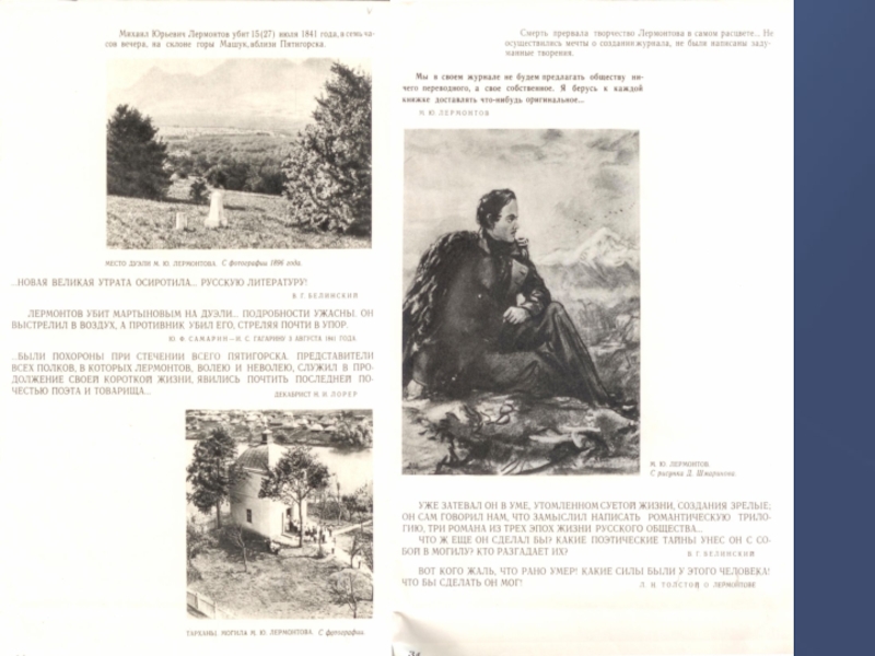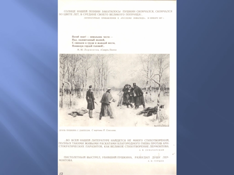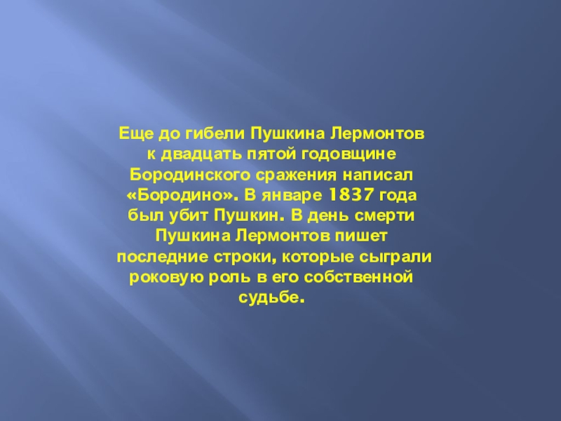 написал «Бородино». В январе 1837 года был убит Пушкин. В день смерти Пушкина Лермонтов пишет последние строки, которые сыграли роковую роль в его собственной судьбе.