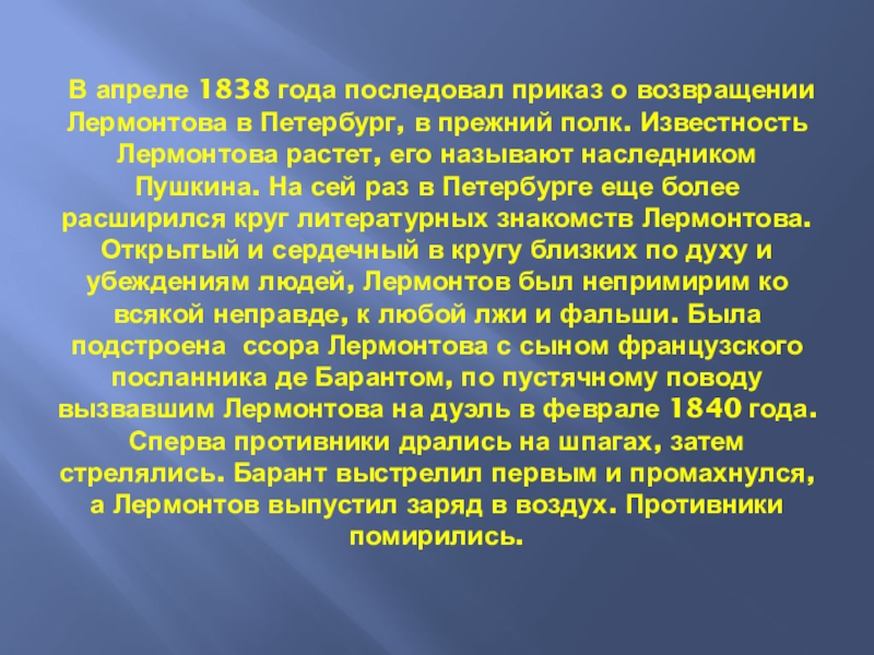 Петербург, в прежний полк. Известность Лермонтова растет, его называют наследником Пушкина. На сей раз в Петербурге еще более расширился круг литературных знакомств Лермонтова. Открытый и сердечный в кругу близких по духу и убеждениям людей, Лермонтов был непримирим ко всякой неправде, к любой лжи и фальши. Была подстроена ссора Лермонтова с сыном французского посланника де Барантом, по пустячному поводу вызвавшим Лермонтова на дуэль в феврале 1840 года. Сперва противники дрались на шпагах, затем стрелялись. Барант выстрелил первым и промахнулся, а Лермонтов выпустил заряд в воздух. Противники помирились.