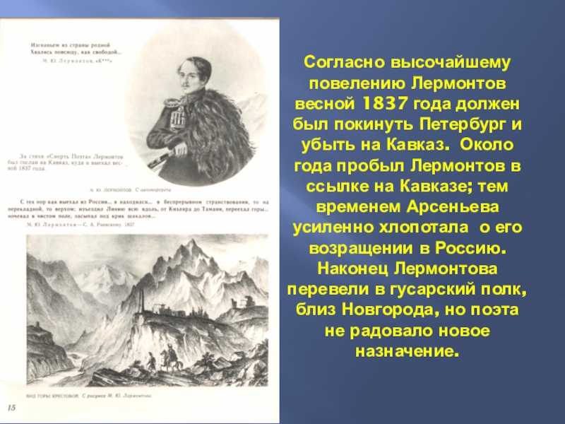 Слайд 12Согласно высочайшему повелению Лермонтов весной 1837 года должен был покинуть Петербург