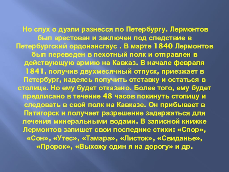 и заключен под следствие в Петербургский ордонансгаус . В марте 1840 Лермонтов был переведен в пехотный полк и отправлен в действующую армию на Кавказ. В начале февраля 1841, получив двухмесячный отпуск, приезжает в Петербург, надеясь получить отставку и остаться в столице. Но ему будет отказано. Более того, ему будет предписано в течение 48 часов покинуть столицу и следовать в свой полк на Кавказе. Он прибывает в Пятигорск и получает разрешение задержаться для лечения минеральными водами. В записной книжке Лермонтов запишет свои последние стихи: «Спор», «Сон», «Утес», «Тамара», «Листок», «Свиданье», «Пророк», «Выхожу один я на дорогу» и др.
