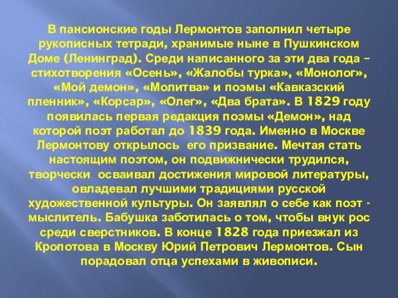 Пушкинском Доме (Ленинград). Среди написанного за эти два года – стихотворения «Осень», «Жалобы турка», «Монолог», «Мой демон», «Молитва» и поэмы «Кавказский пленник», «Корсар», «Олег», «Два брата». В 1829 году появилась первая редакция поэмы «Демон», над которой поэт работал до 1839 года. Именно в Москве Лермонтову открылось его призвание. Мечтая стать настоящим поэтом, он подвижнически трудился, творчески осваивал достижения мировой литературы, овладевал лучшими традициями русской художественной культуры. Он заявлял о себе как поэт - мыслитель. Бабушка заботилась о том, чтобы внук рос среди сверстников. В конце 1828 года приезжал из Кропотова в Москву Юрий Петрович Лермонтов. Сын порадовал отца успехами в живописи.