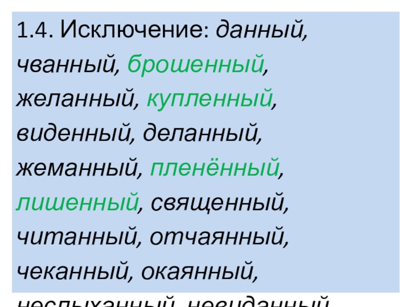 Слайд 171.4. Исключение: данный, чванный, брошенный, желанный, купленный, виденный, деланный, жеманный, пленённый,