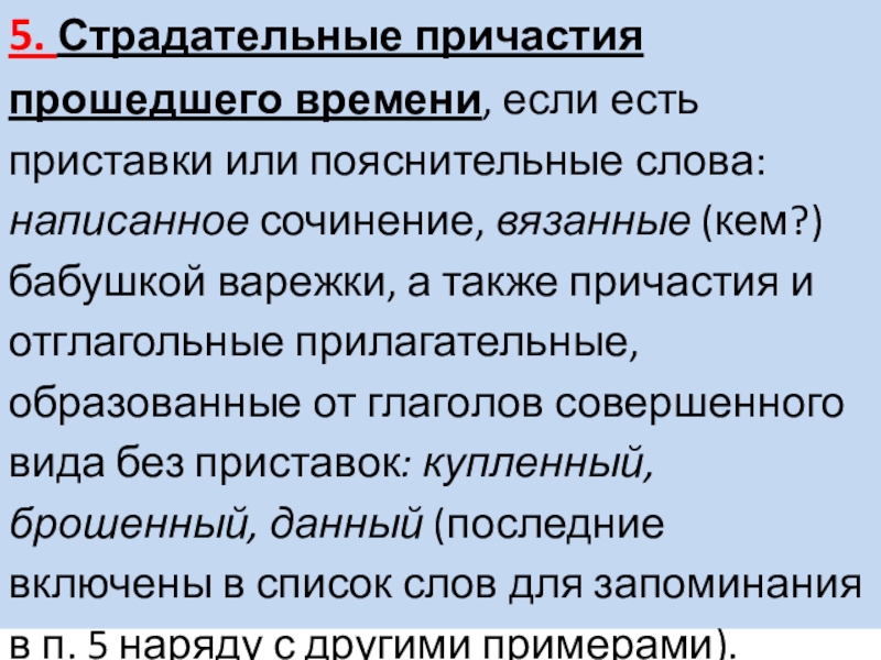 написанное сочинение, вязанные (кем?) бабушкой варежки, а также причастия и отглагольные прилагательные, образованные от глаголов совершенного вида без приставок: купленный, брошенный, данный (последние включены в список слов для запоминания в п. 5 наряду с другими примерами).