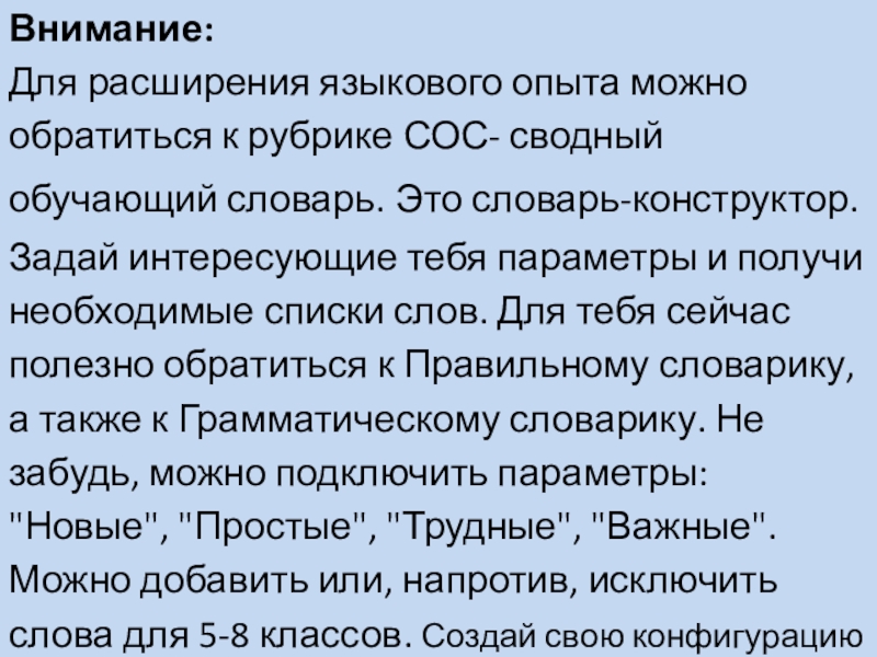 словарь. Это словарь-конструктор. Задай интересующие тебя параметры и получи необходимые списки слов. Для тебя сейчас полезно обратиться к Правильному словарику, а также к Грамматическому словарику. Не забудь, можно подключить параметры: "Новые", "Простые", "Трудные", "Важные". Можно добавить или, напротив, исключить слова для 5-8 классов. Создай свою конфигурацию словаря по теме задания 14.