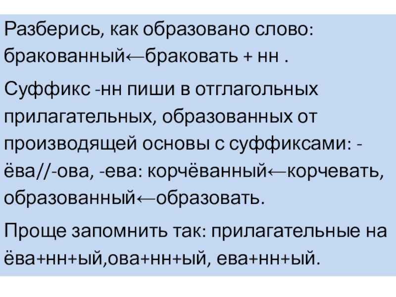 Слайд 15Разберись, как образовано слово: бракованный←браковать + нн .