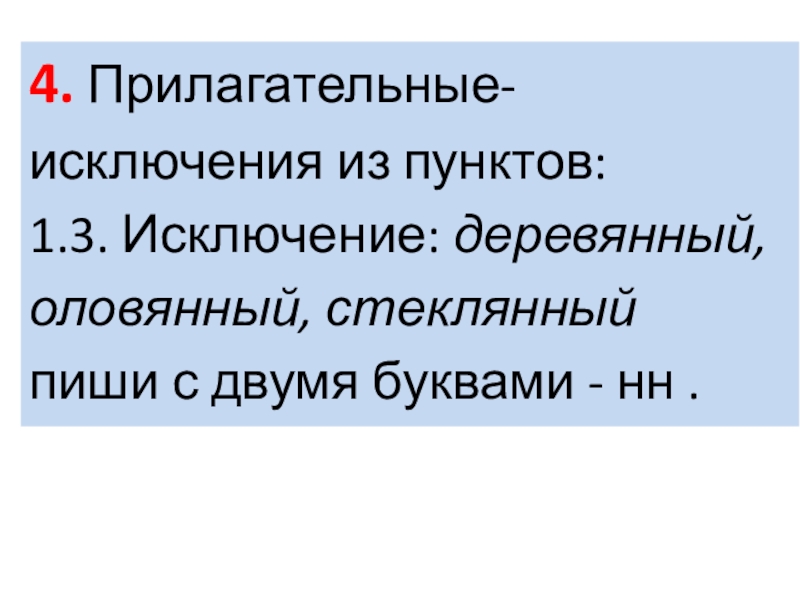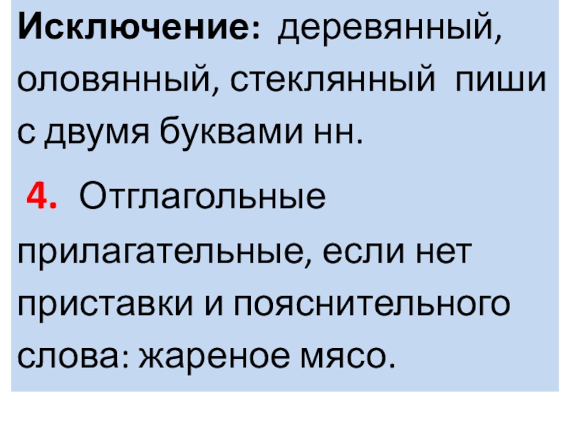 Слайд 6Исключение: деревянный, оловянный, стеклянный пиши с двумя буквами нн.