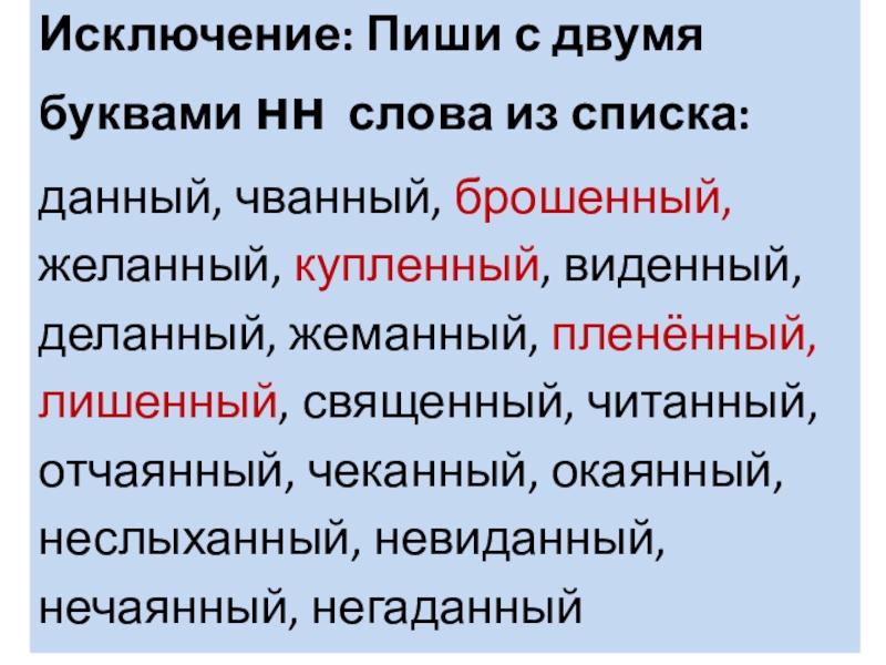 Слайд 7Исключение: Пиши с двумя буквами нн слова из списка: