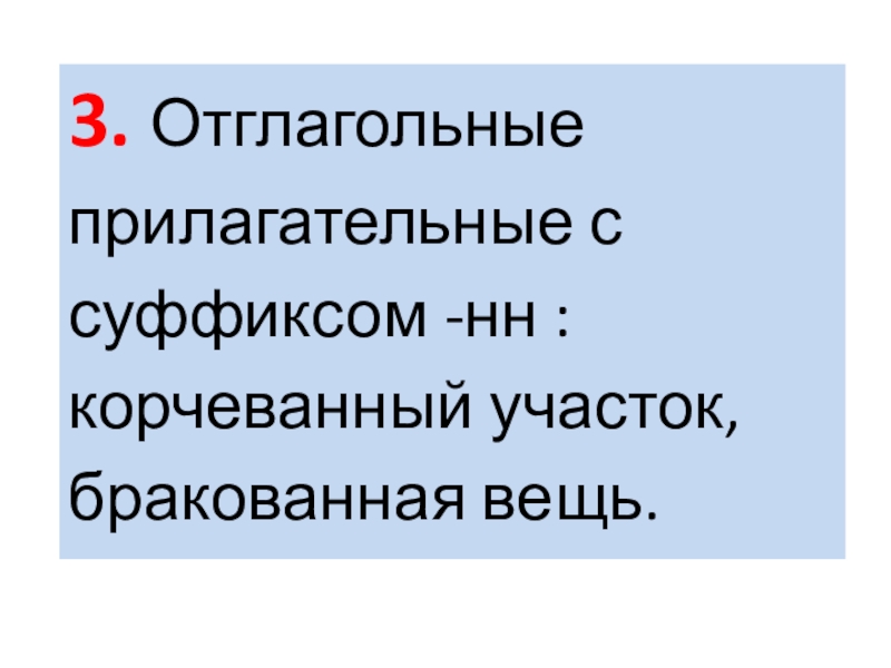 Слайд 143. Отглагольные прилагательные с суффиксом -нн : корчеванный участок, бракованная вещь.