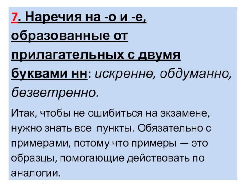 Итак, чтобы не ошибиться на экзамене, нужно знать все пункты. Обязательно с примерами, потому что примеры — это образцы, помогающие действовать по аналогии.