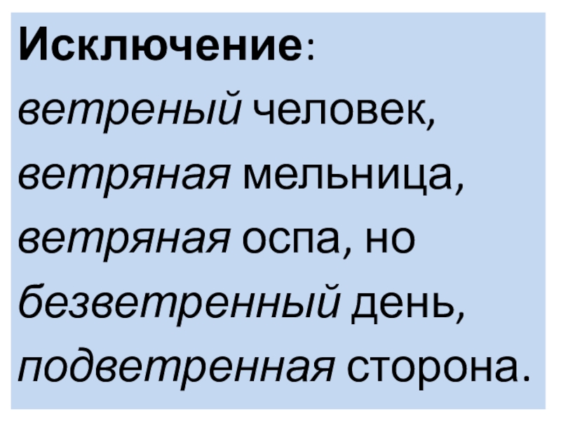 Слайд 13Исключение: ветреный человек, ветряная мельница, ветряная оспа, но безветренный день, подветренная