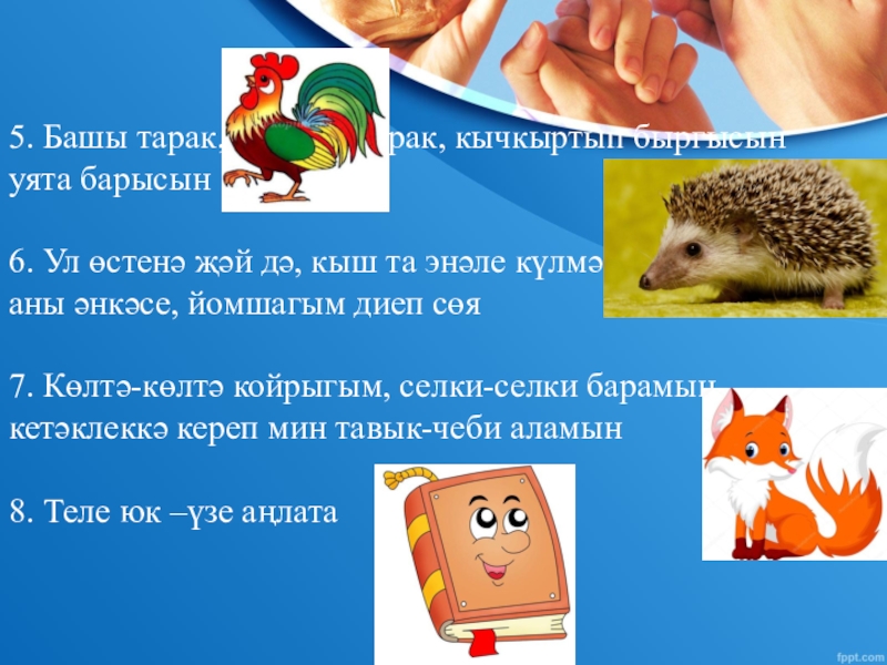 7. Көлтә-көлтә койрыгым, селки-селки барамын, кетәклеккә кереп мин тавык-чеби аламын