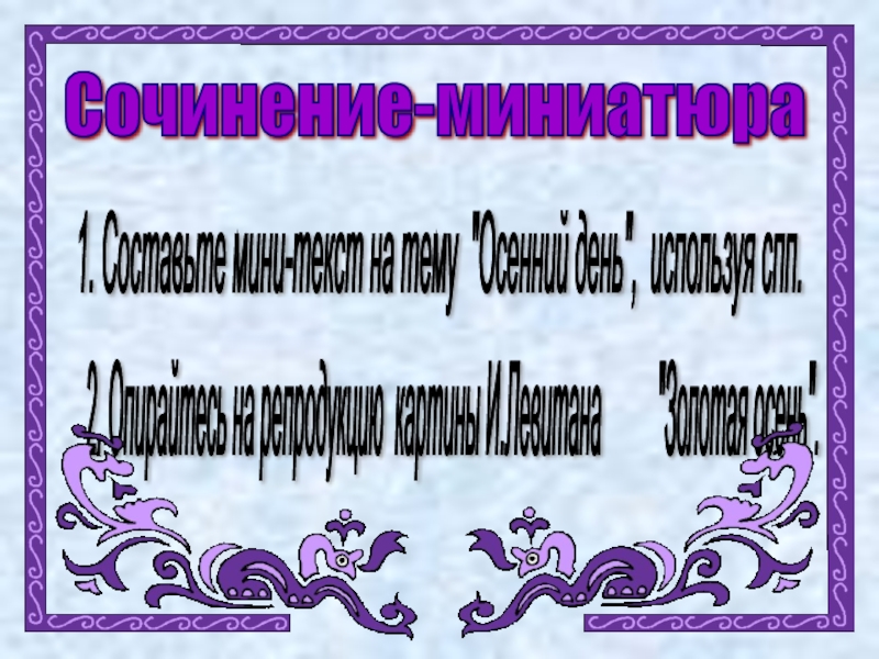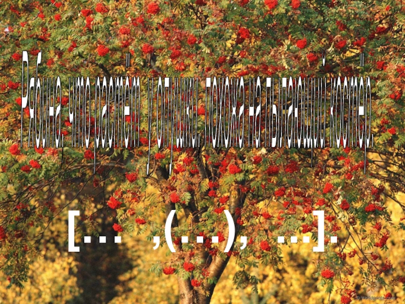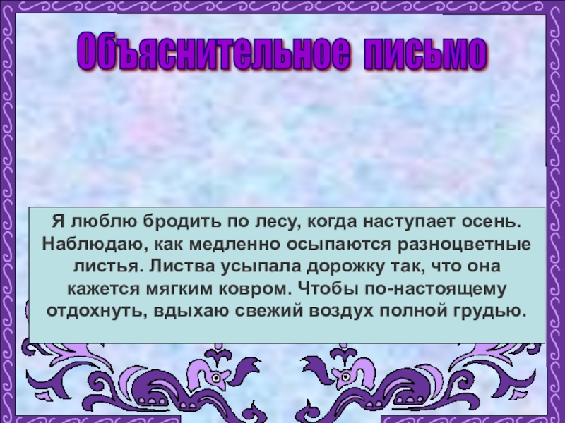 Я люблю бродить по лесу, когда наступает осень. Наблюдаю, как медленно осыпаются разноцветные листья. Листва усыпала дорожку так, что она кажется мягким ковром. Чтобы по-настоящему отдохнуть, вдыхаю свежий воздух полной грудью.