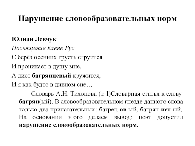 Словарь А.Н. Тихонова (т. I)Словарная статья к слову багрян(ый). В словообразовательном гнезде данного слова только два прилагательных: багрец-ов-ый, багрян-ист-ый. На основании этого делаем вывод: поэт допустил нарушение словообразовательных норм.