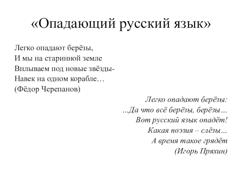 обозначили в проекте: язык переживает не лучшие времена. Сегодня мы говорим не о «великом, могучем», а об «опадающем» русском языке. (И.И. Пряхин)