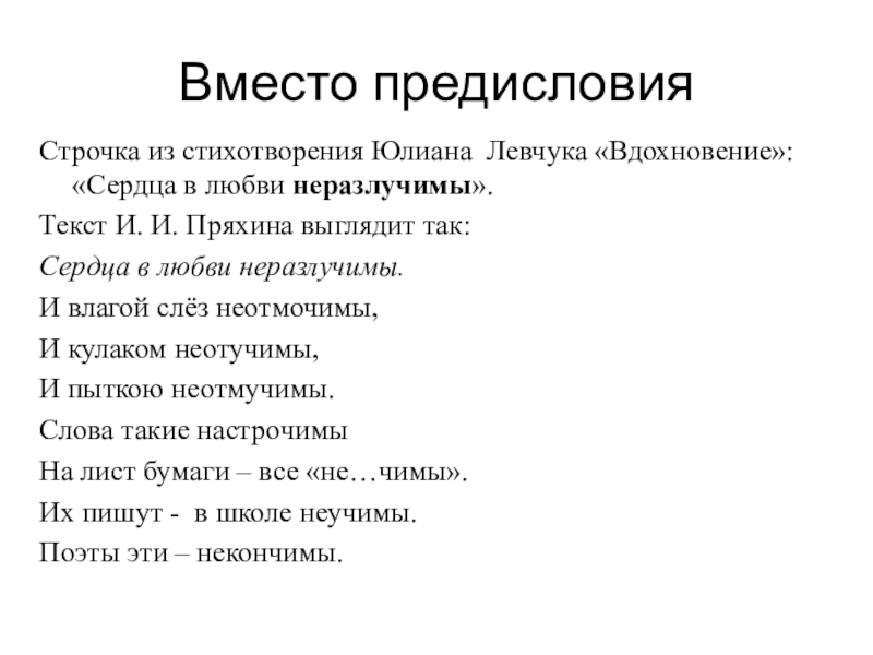 Строчка из стихотворения Юлиана Левчука «Вдохновение»:«Сердца в любви неразлучимы».
